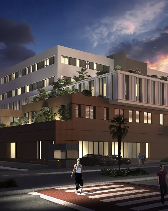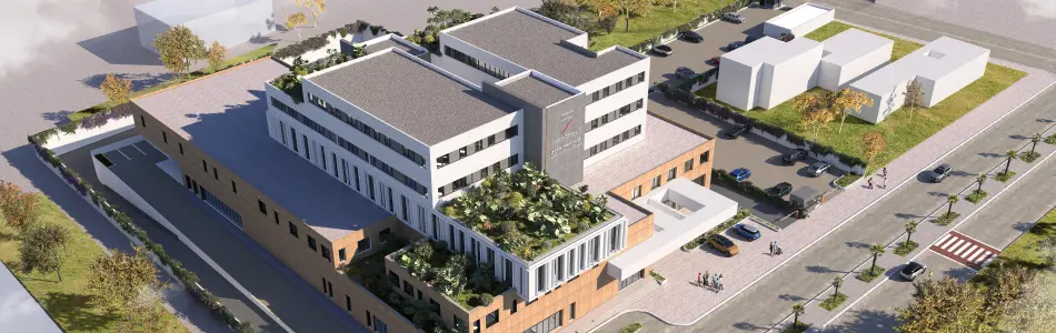 Ses volumes épurés, son socle commun et ses façades en fibre-ciment traduisent une écriture contemporaine, ancrée dans le tissu urbain d’Oujda. Pensée comme un bâtiment HQE, la clinique intègre toitures végétalisées, panneaux photovoltaïques et gestion raisonnée des flux, affirmant une approche durable et maîtrisée du projet hospitalier.