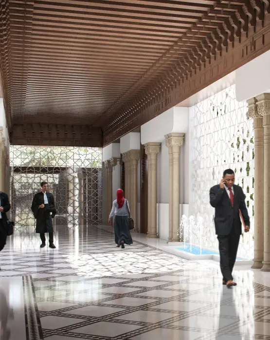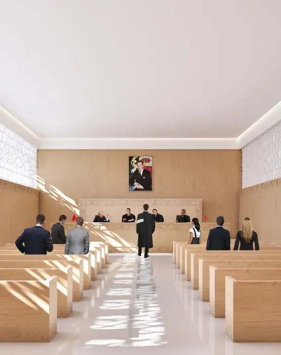 Notre démarche a consisté à structurer les espaces autour de cours et de patios intérieurs, apportant lumière naturelle et lisibilité à l’ensemble du bâtiment. L’organisation spatiale favorise la fluidité des parcours entre les différentes zones : salles d’audience, espaces administratifs et zones d’accueil.